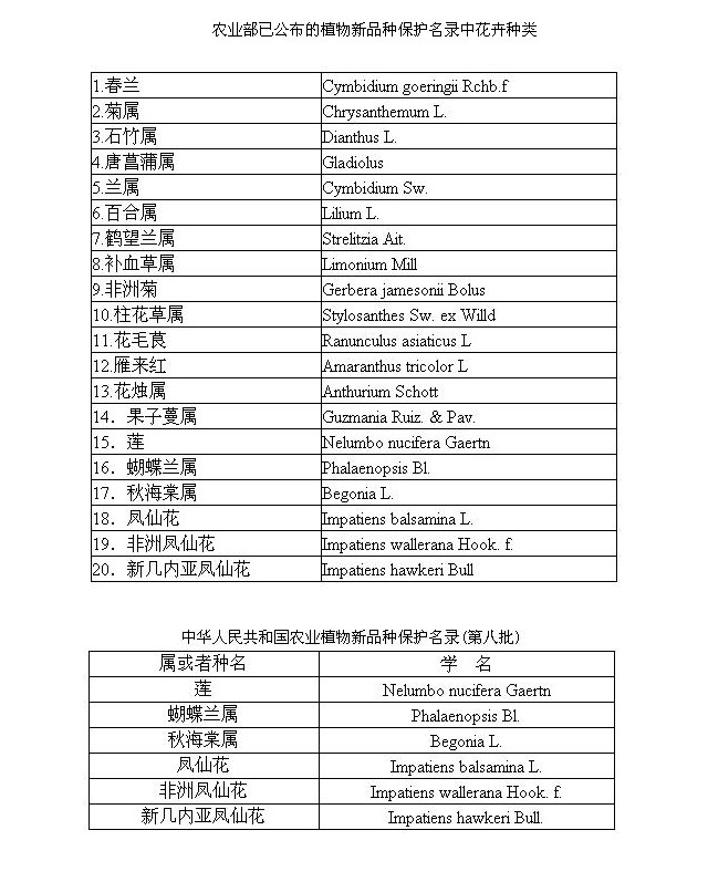 农业部已公布的植物新品种保护名录中花卉种类