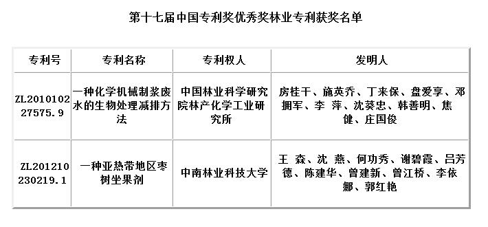 2项林业专利荣获第十七届中国专利奖